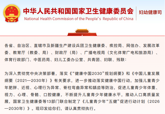 为深入贯彻党中央决策部署,落实《“健康中国2030”规划纲要》和《中国儿童发展纲要(2021—2030年)》有关要求,进一步推动落实健康中国行动,加强儿童青少年肥胖、近视、心理行为异常、脊柱弯曲异常和龋齿等防治,促进儿童青少年体重、视力、心理、骨骼、口腔健康,不断提升儿童青少年健康水平,推动人口高质量发展,国家卫生健康委等13部门联合制定了《儿童青少年“五健”促进行动计划(2026—2030年)》